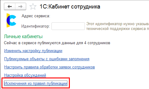 Добавлена возможность настройки списка сотрудников-исключений из правил публикации кабинетов. В список можно внести сотрудников, кабинеты для которых необходимо публиковать или не публиковать независимо от настройки публикации для позиций.