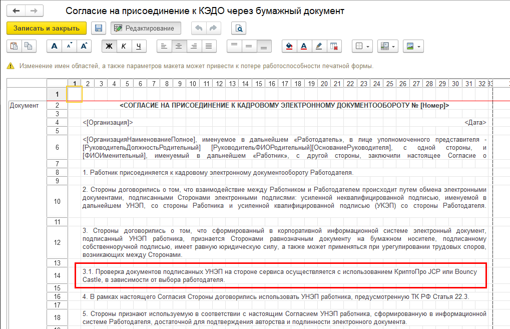 В шаблоне текста печатной формы документа "Согласие на присоединение к КЭДО" добавлен пункт 3.1 и параметры для заполнения полей в различных падежах: