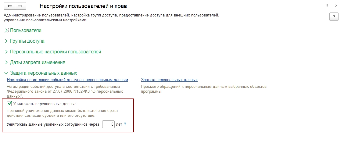 Для возможности уничтожения персональных данных необходимо в панели «Администрирование – Настройки пользователей и прав» установить флажок «Уничтожать персональные данные» и указать срок хранения персональных данных сотрудника после его увольнения (по умолчанию 5 лет).