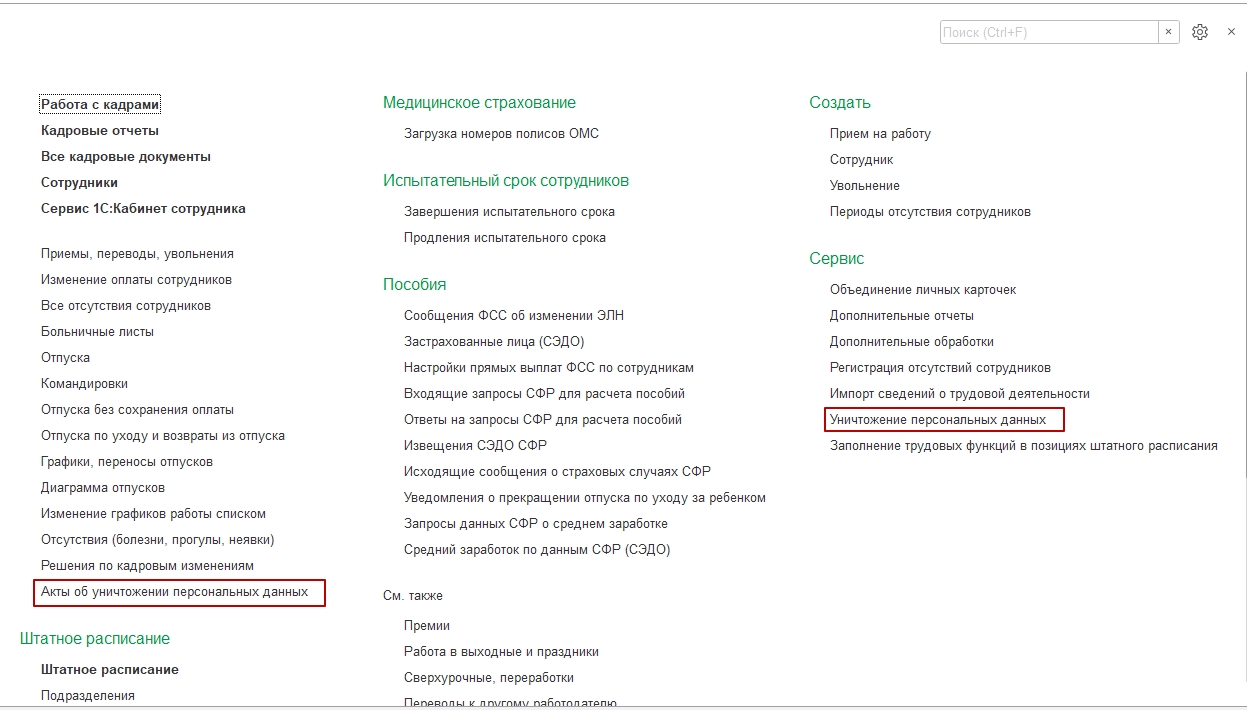 Основным инструментом для уничтожения персональных данных является рабочее место «Уничтожение персональных данных». Открыть рабочее место можно из раздела «Кадры».