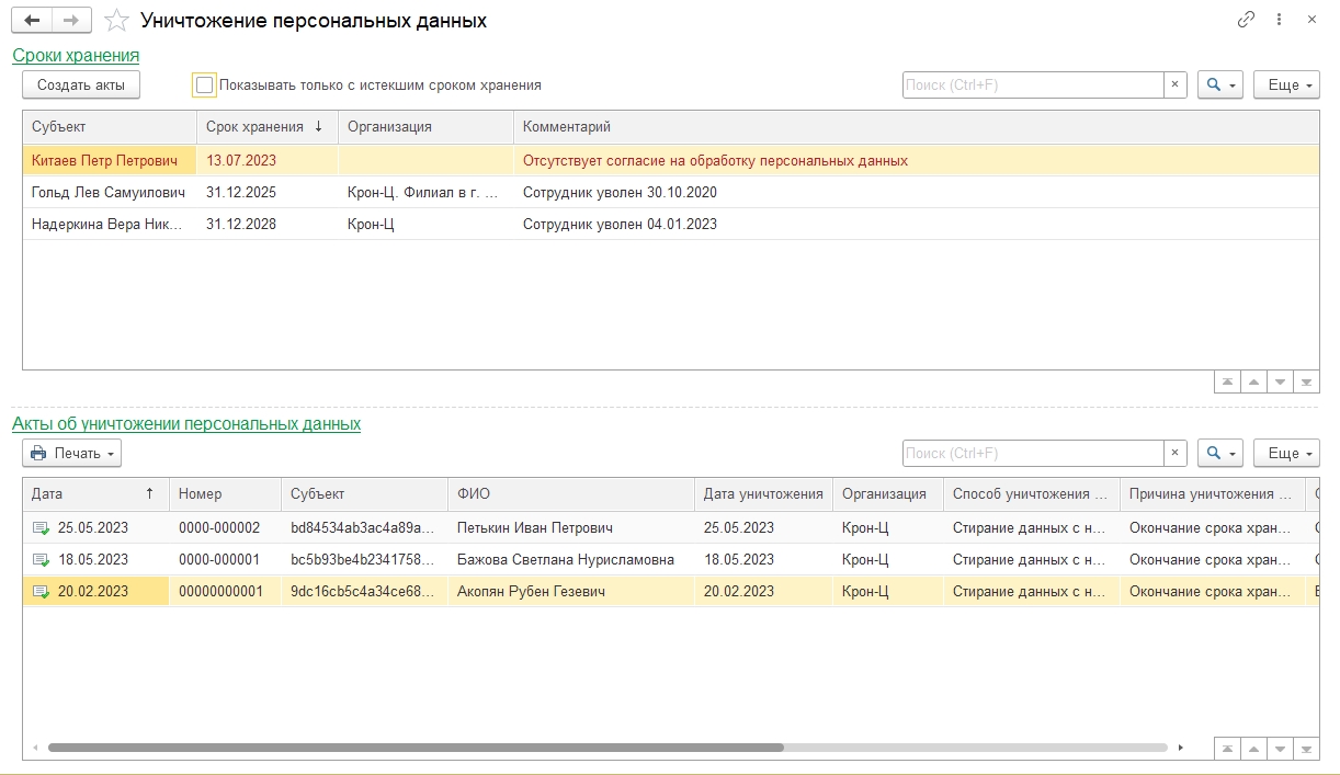 Пользователь с правами старшего кадровика может отслеживать сроки хранения персональных данных субъектов и формировать акты об уничтожении персональных данных.