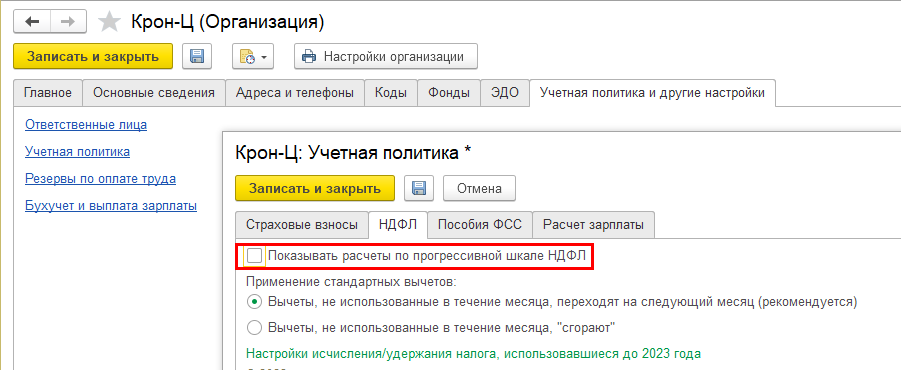 Настройка расчета по прогрессивной шкале НДФЛ теперь не влияет на расчет и переименована в "Показывать расчеты по прогрессивной шкале НДФЛ". Расчет теперь всегда выполняется как при включенной настройке.