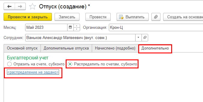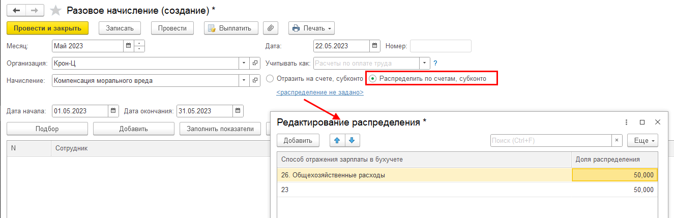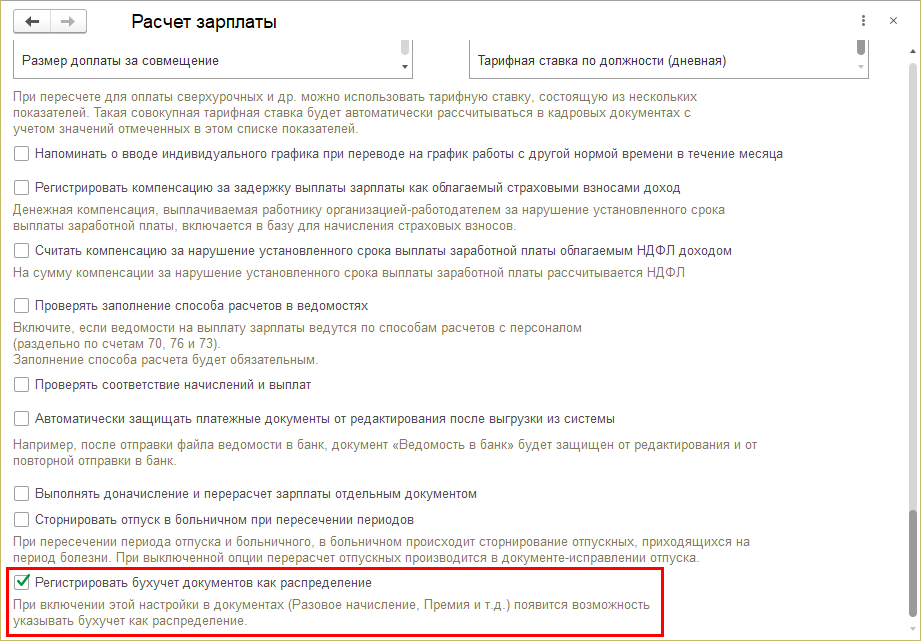 Указание распределения доступно, если в настройках расчета зарплаты включена новая настройка "Регистрировать бухучет документов как распределение" (в самом низу формы).