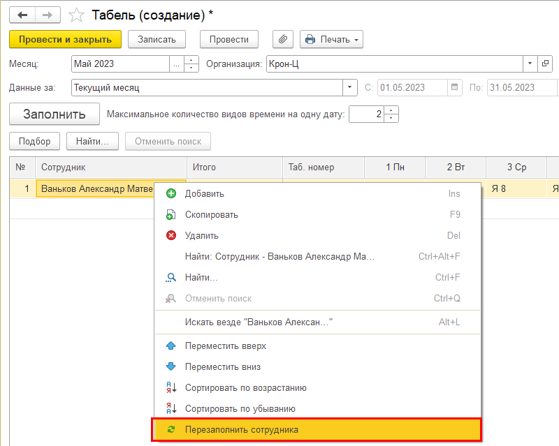 Добавлена команда "Перезаполнить сотрудника" в контекстное меню табличной части (открывается по правой кнопки мыши на строке).