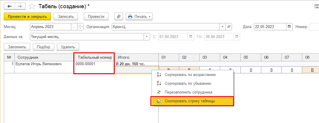 В альтернативной форме табеля (например, когда используются обособленные территории) добавлена возможность скопировать строку (через контекстное меню), а также добавлена колонка с табельным номером.