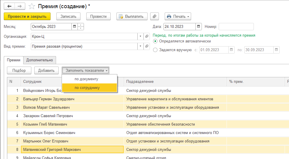 Реализована возможность заполнения показателей по выбранным сотрудникам в документах "Премия" и "Разовое начисление".
