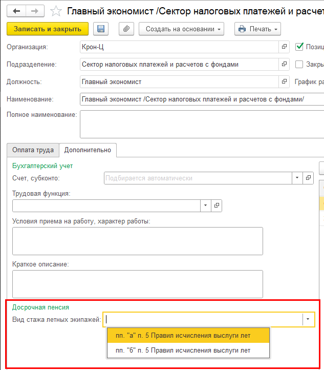 Добавлена возможность выбора в позиции штатного расписания вида стажа летных экипажей и шахтеров (используются в СЗВ-ДСО).