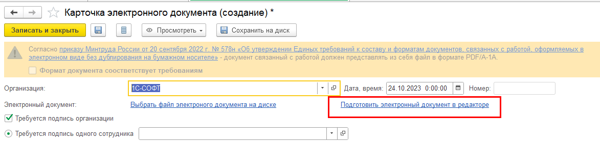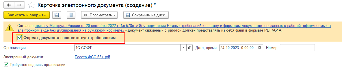 Реализовано формирование файла-описания по приказу 578н для приложенных вручную файлов PDF. Если документ является файлом требуемого законодательством формата PDF/A-1A, нужно установить флажок "Формат документа соответствует требованиям".