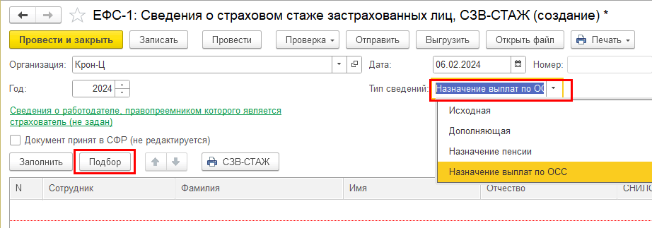 Добавлен новый тип сведений подраздела 1.2 "Назначение выплат по ОСС". Сотрудников в него необходимо добавлять подбором. Если введен больничный по беременности и родам или отпуск по уходу – заполняется стаж до начала как обычно и указывается в стаже первый день больничного или отпуска по уходу. Также такие сотрудники будут попадать в итоговую форму за год с типом Исходная.