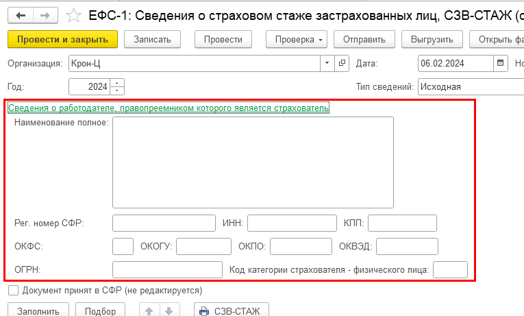В СЗВ-СТАЖ, СЗВ-КОРР, ОДВ-1 и СЗВ-ТД добавлены реквизиты прежнего страхователя (в СЗВ-ТД часть реквизитов уже была). При заполнении выводятся в печатной форме и файле.