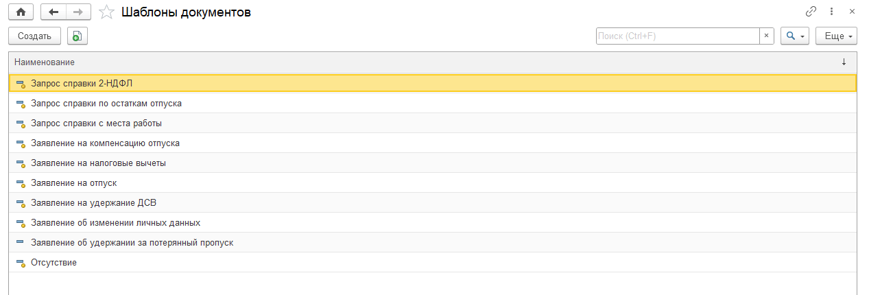 В справочнике "Шаблоны документов", помимо наименования шаблона, задаются его настройки. Предопределенные элементы соответствуют предопределенным документам в 1С:Кабинет сотрудника.