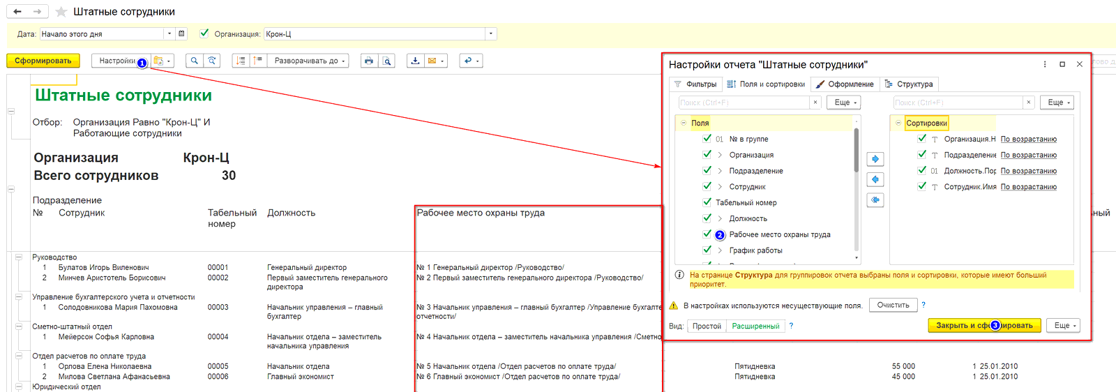 В кадровых отчетах по сотрудникам, например, в отчете "Штатные сотрудники" появляется возможность вывести в отчет рабочее место охраны труда.