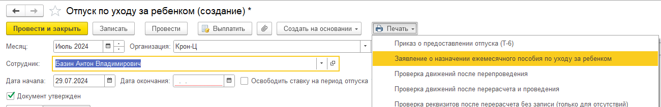 Печатная форма "Заявление о назначении ежемесячного пособия по уходу за ребенком" добавлена в документы "Отпуск по уходу за ребенком" и "Исходящее сообщение о страховом случае СФР".