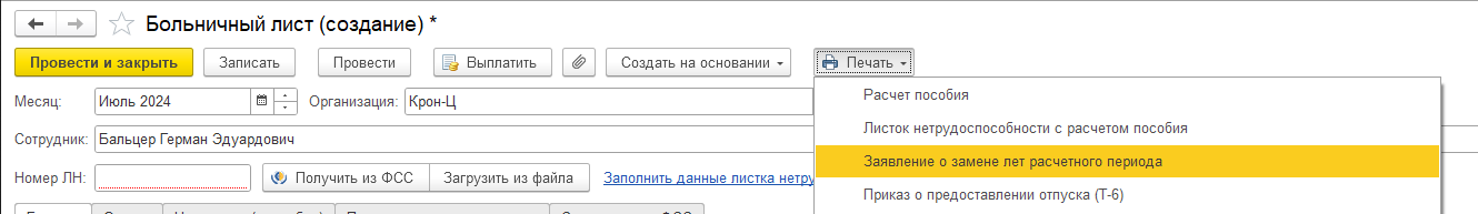 Печатная форма "Заявление о замене лет расчетного периода" добавлена в документы "Отпуск по уходу за ребенком" и "Больничный лист" (доступна когда заменены годы расчетного периоды).