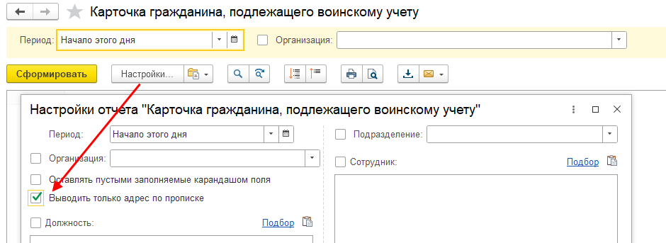 В отчеты "Список граждан для сверки с военкоматом" и "Карточка гражданина, подлежащего воинскому учету" добавлена настройка "Выводить только адрес по прописке".