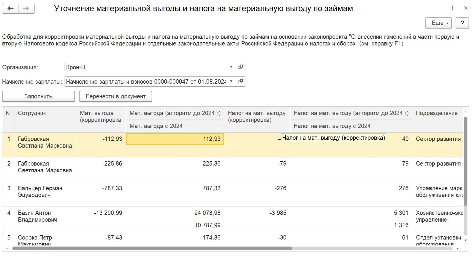 По кнопке "Перенести в документ" создаётся документ "Начисление зарплаты". В документе заполняется вкладка "Займы", где заполняются суммы материальной выгоды и налога по данным рассчитанных корректировок. Если документ ранее выбран на форме, то по кнопке "Перенести в документ", строки добавляются на вкладку "Займы". Сколько договоров-займов было в документе погашения займа - столько и строк будет в инструменте.