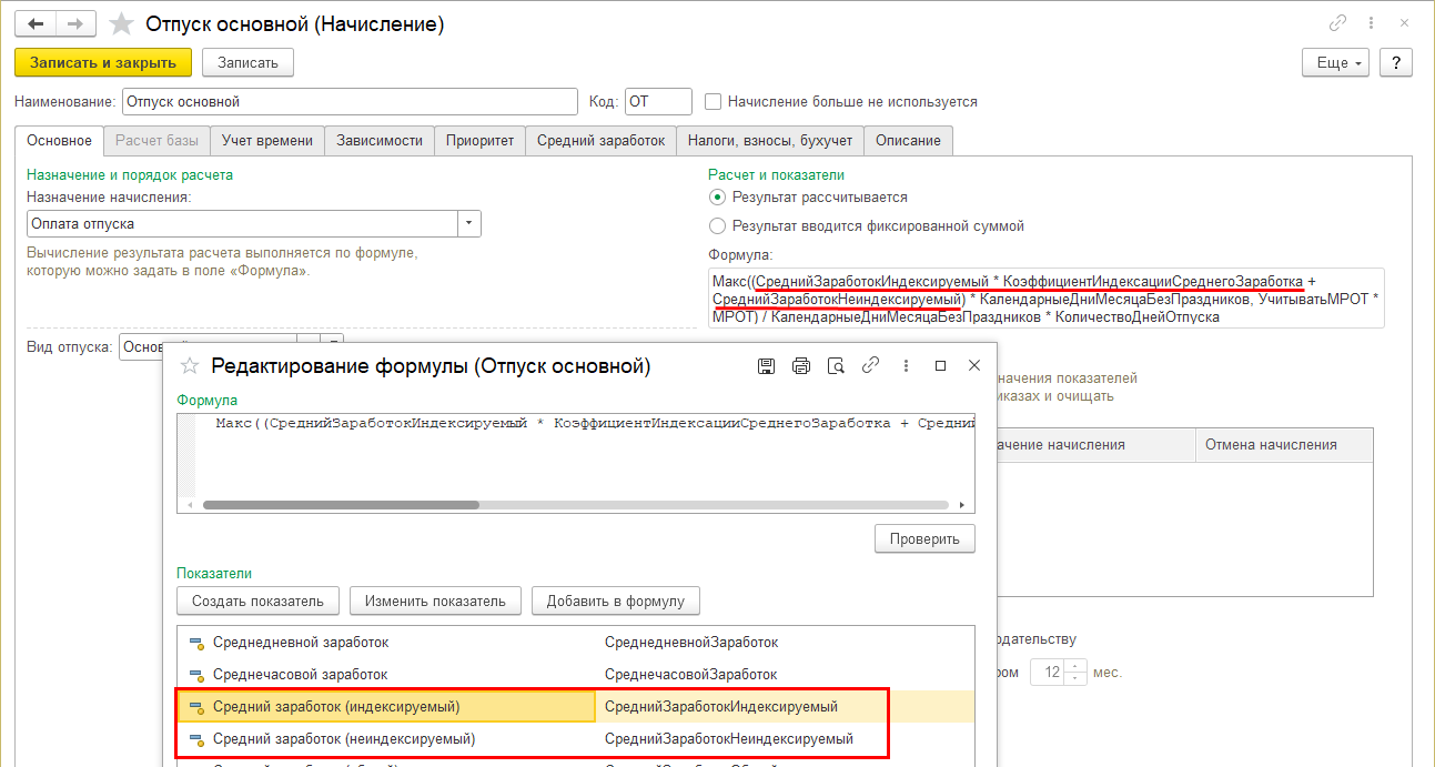 Добавлены два новых предопределенных показателя – СреднийЗаработокИндексируемый и СреднийЗаработокНеиндексируемый. При необходимости следует подставить эти показатели в формулы расчета начислений. Нужно заменить