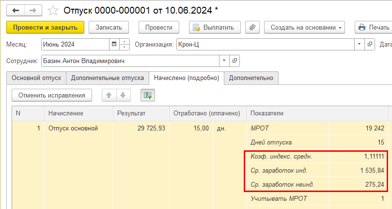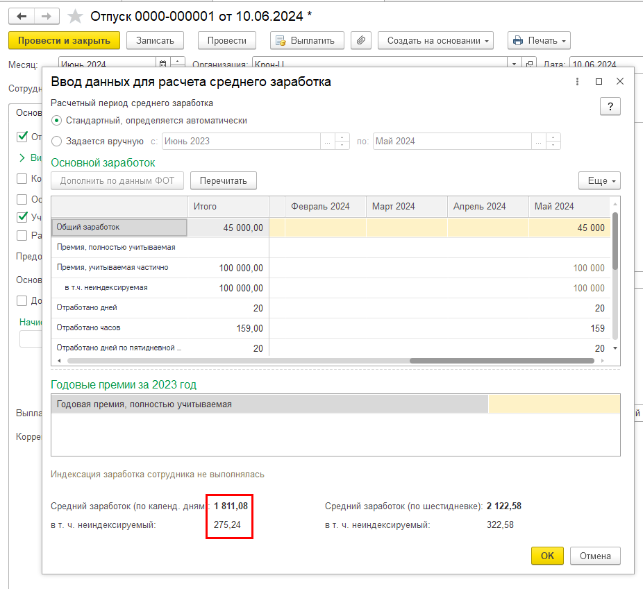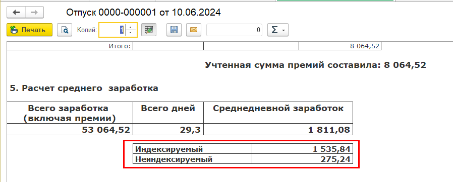 Неиндексируемая часть отображается в калькуляторе среднего заработка и в печатных формах.