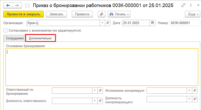 В документ также добавлена закладка "Дополнительно" для заполнения данных приказа.