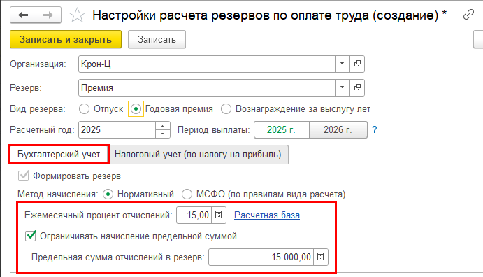 Если выбран период выплаты – следующий год, то при выплате премии она будет отражена за счет резерва в случае, если выплачена в периоде с Января по Ноябрь следующего года (чтобы исключить пересечение настроек в Декабре).