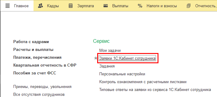 Регистрация заявок из сервиса теперь выполняется как регистрация документов в журнале "Заявки сотрудников из сервиса 1С:Кабинет сотрудника".