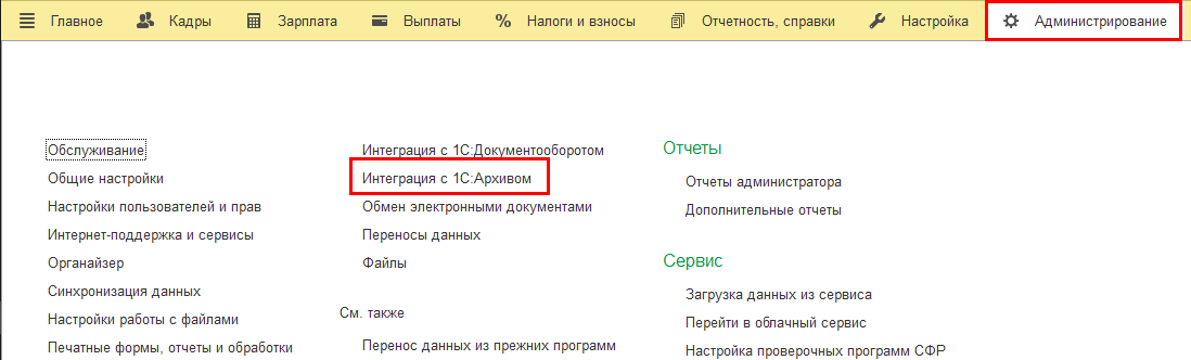 Реализована интеграция с 1С:Архив. Она включается в разделе Администрирование.