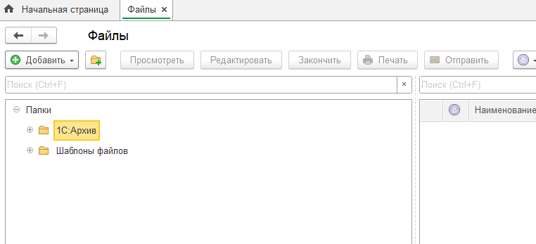 Также в разделе Администрирование – Файлы на панели слева появляется группа "1С:Архив", в которую будут сохраняться варианты отчетов для выгрузки в Архив. При выключении интеграции эта папка помечается на удаление, если в ней нет файлов.