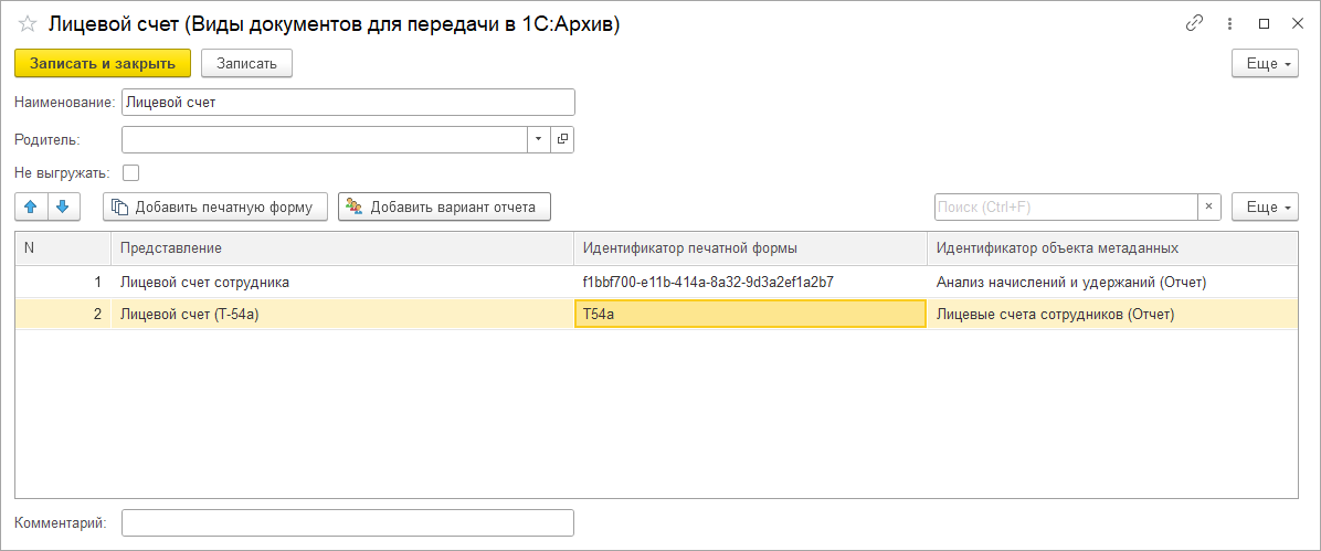 После произведённых настроек при присоединении печатных форм к документу – сведения для выгрузки в 1С:Архив будут определены автоматически.