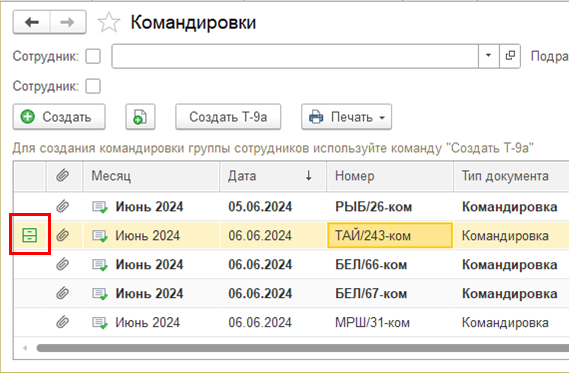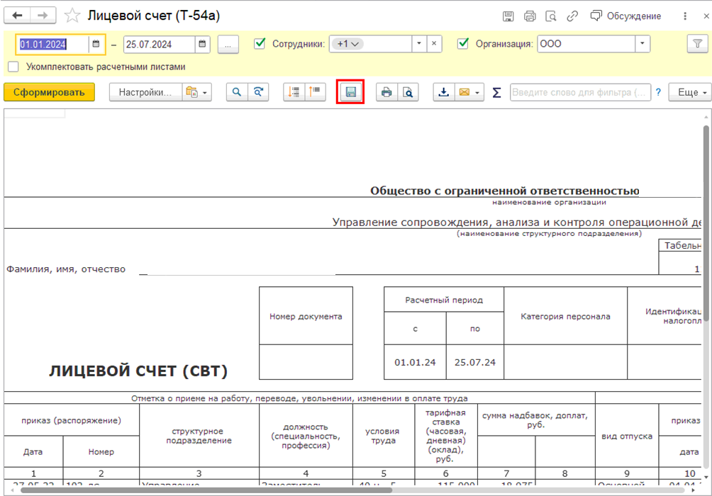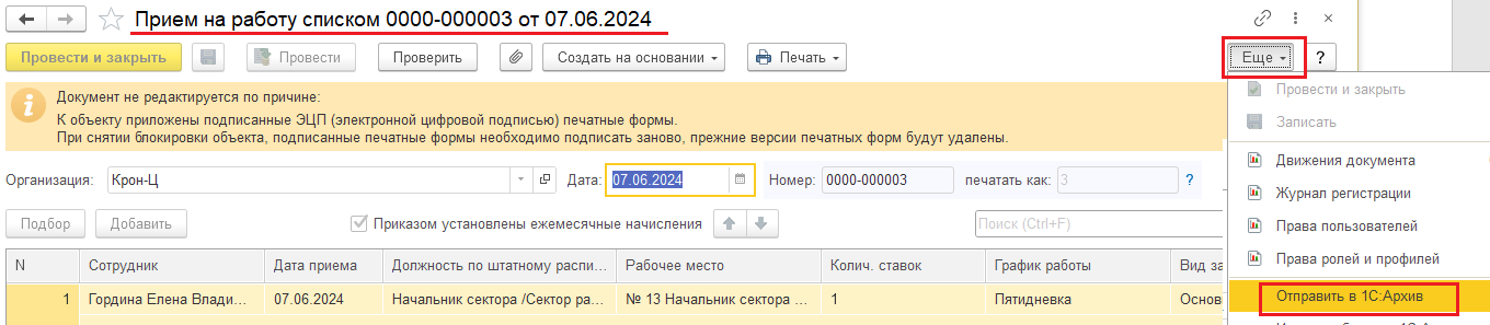 В кадровых документах эта кнопка расположена в меню "Еще" в правом верхнем углу над табличной частью документа.