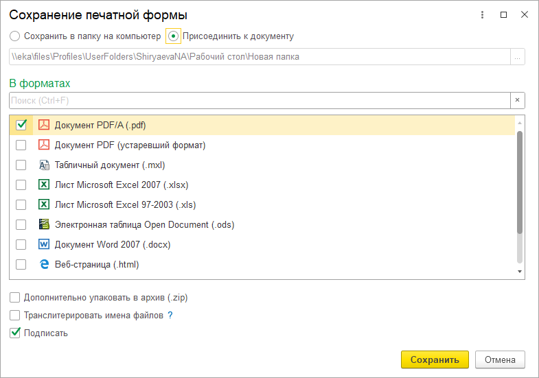 Далее нажимаем на появившийся значок дискеты, в открывшемся окне выбираем "Присоединить к документу", формат – документ PDF/A (утвержденный законодательно формат), и "Подписать".