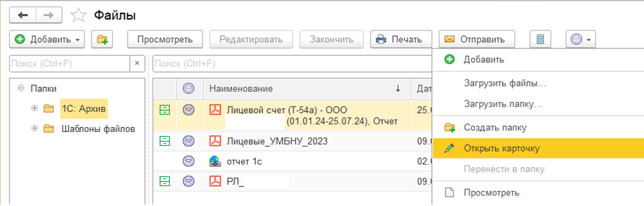 В карточке присоединенного файла можно проверить и изменить автоматически заполненные для выгрузки в 1С:Архив данные. Для этого встаем на интересующий нас файл (файл, который хотим выгрузить в 1С:Архив), и либо через меню "Еще", либо правой кнопкой мыши нажать и вывести меню, выбрать "Открыть карточку".