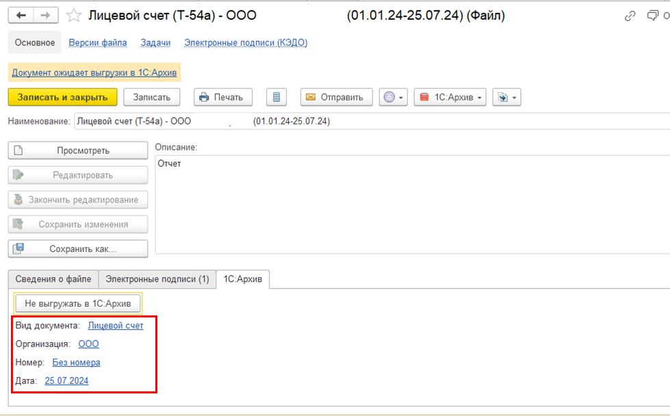 При передаче печатной формы в сервис "1С:Кабинет сотрудника" файл также присоединяется к документу. У него аналогично определяются вид документа, организация, дата, номер. Но при выгрузке в 1С:Архив дополнительно в документе архива заполняется: