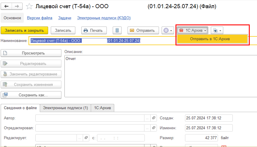 При присоединении любой печатной формы указанных выше документов/справочников в карточке присоединённого файла на закладке "1С:Архив" заполняются сведения о файле:
