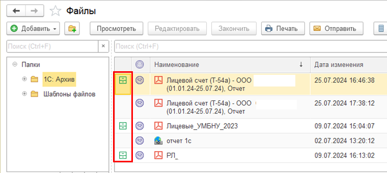 Знак тумбочки в формах списков означает, что файл выгружен в 1С:Архив.