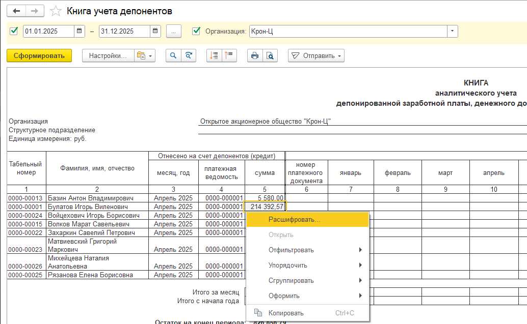 Реализована расшифровка сумм в отчете "Книга учета депонентов".
