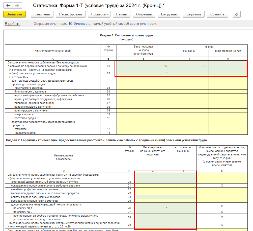 Реализовано автоматическое заполнение некоторых строк формы 1-Т (условия труда).