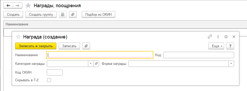 Выполнено расширение состава сведений о наградах сотрудников, добавлена возможность их подбора из классификатора.