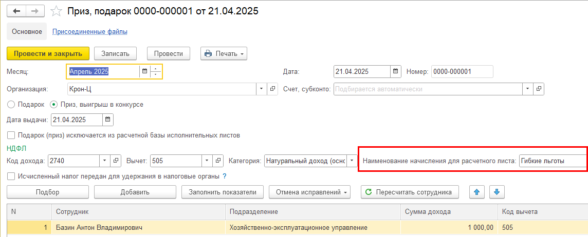Добавлена возможность в документе "Приз, подарок" указать текст для вывода в расчетный листок.