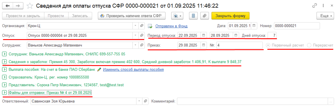 Новый документ "Сведения для оплаты отпуска СФР" имеет следующие основные особенности: