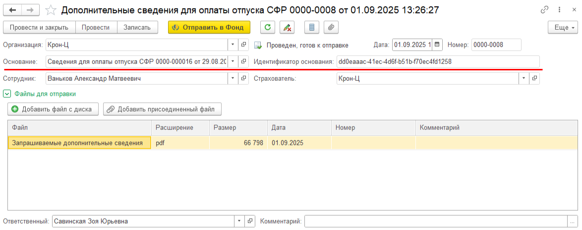Новый документ "Дополнительные сведения для оплаты отпуска СФР" содержит только раздел файлов отправки и данные документа основания. В ответ на отправку этого документа от СФР поступает 95 сообщение. 97 сообщение будет получено в документе-основании.