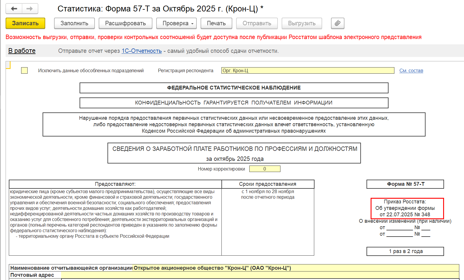 Заполнение формы статистики 57-Т адаптировано для 2025 года, согласно Приказу Росстата от 22.07.2025 № 348.