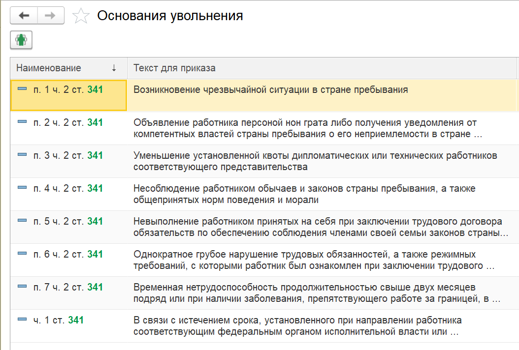 В справочник "Основания увольнения" добавлены пункты и статьи: