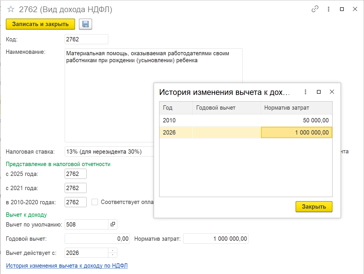Обновлен размер вычета на единовременную матпомощь от работодателя в связи с рождением детей с 2026 года (1 млн. вместо 50 тыс. руб.), в соответствии с Федеральным законом от 23.07.2025 № 227-ФЗ.