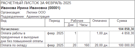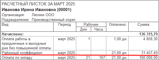 В документе "Увольнение" на закладке "Пересчет начислений" отразится сторно РК, начисленного за месяц, когда у сотрудника было накоплено право на отгул, и повторное начисление РК с учетом компенсации неиспользованных дней отдыха текущего документа.