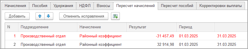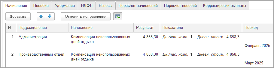 Также реализован расчет зависимых начислений (РК, СН) на компенсацию отгулов, заработанных в предшествующие месяцу увольнения периоды. Расчет зависимых начислений выполняется на вкладке "Пересчет начислений".