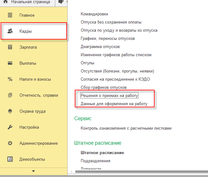 В документе "Решение о приеме на работу" создается запрос данных для оформления на работу. Данные для оформления на работу отправляются в 1С:Кабинет сотрудника. После получения данных от принимаемого на работу, кадровик проверяет данные и принимает их.
