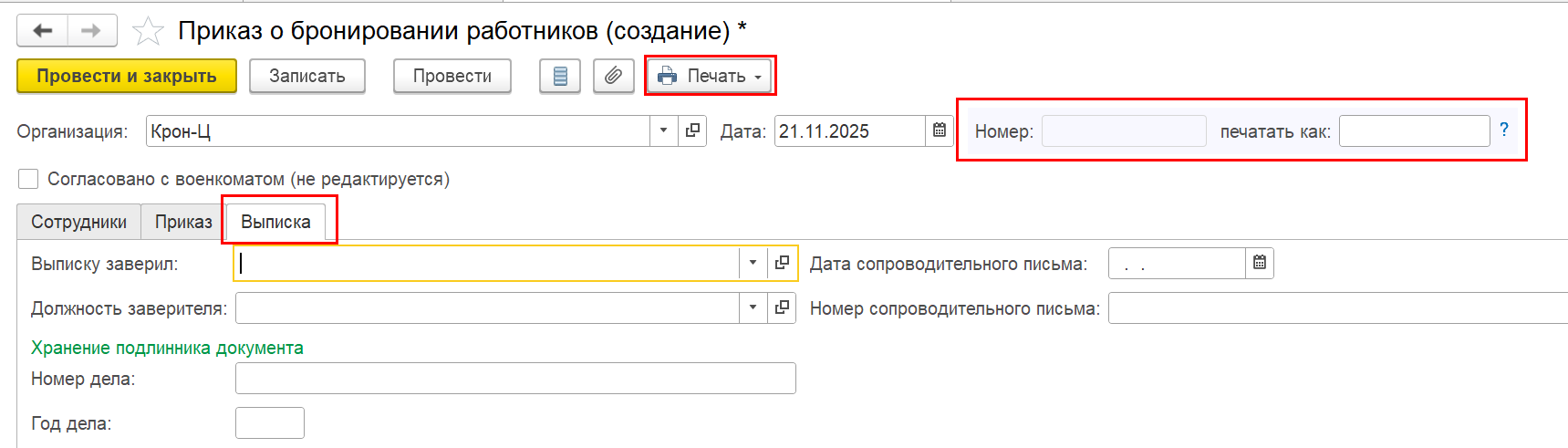 В документ "Приказ о бронировании работников" добавлена страница "Выписка" с реквизитами для заполнения выписки, а также печатная форма "Выписка из приказа о бронировании".