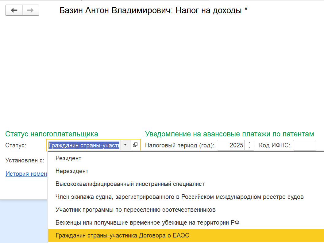 По итогам 2025 года в обязательном порядке необходимо заменить статус "Гражданин страны-участника Договора о ЕАЭС" на статус Нерезидент или Резидент, и произвести перерасчет налога.