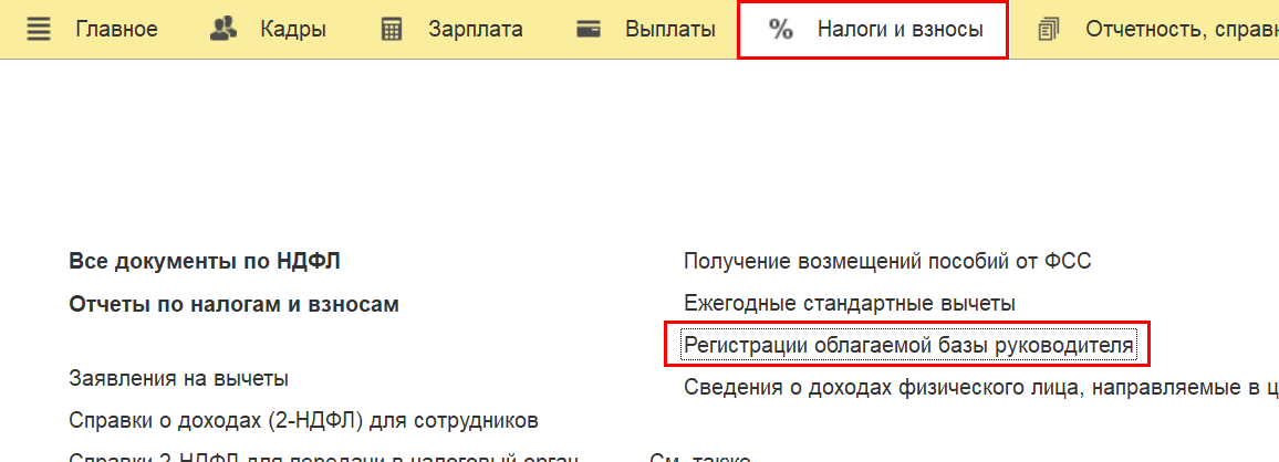 и документ "Регистрация облагаемой базы руководителя" (раздел "Налоги и взносы").