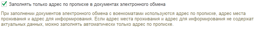 В формате данных для обмена предусмотрена передача данных об адресе места жительства, адреса места пребывания и фактического адреса. В программе по умолчанию для этого используются адрес по прописке, адрес места проживания и адрес для информирования соответственно. Но часто человек состоит на учете в военкомате по месту прописки, даже если заполнены другие адреса. И многие пользователи хотят видеть только адрес по прописке в отчетах воинского учета (в нескольких отчетах ранее была реализована такая настройка). При заполнении документов тоже нужна возможность не заполнять адрес места пребывания и фактический адрес. Для этого добавлена настройка кадрового учета (воинский учет) "Заполнять только адрес по прописке в документах электронного обмена".
